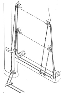 One weekend, I strung the lines through the boom, along with a new outhaul. Yesterday, I installed two boom bails – using a rivet gun for the first time – and rigged the lines like this: